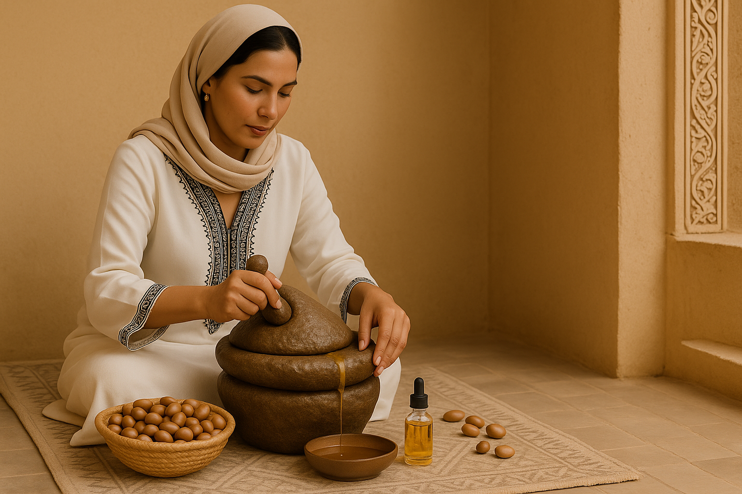 Née au cœur des terres arides du sud marocain, l’huile d’argan est extraite avec patience et savoir-faire des fruits de l’arganier, un arbre rare et majestueux. Transmise de génération en génération, cette huile précieuse était autrefois le secret des femmes berbères pour sublimer leur peau et leurs cheveux face aux vents du désert. Aujourd’hui, ce trésor ancestral s’invite dans votre rituel de beauté.